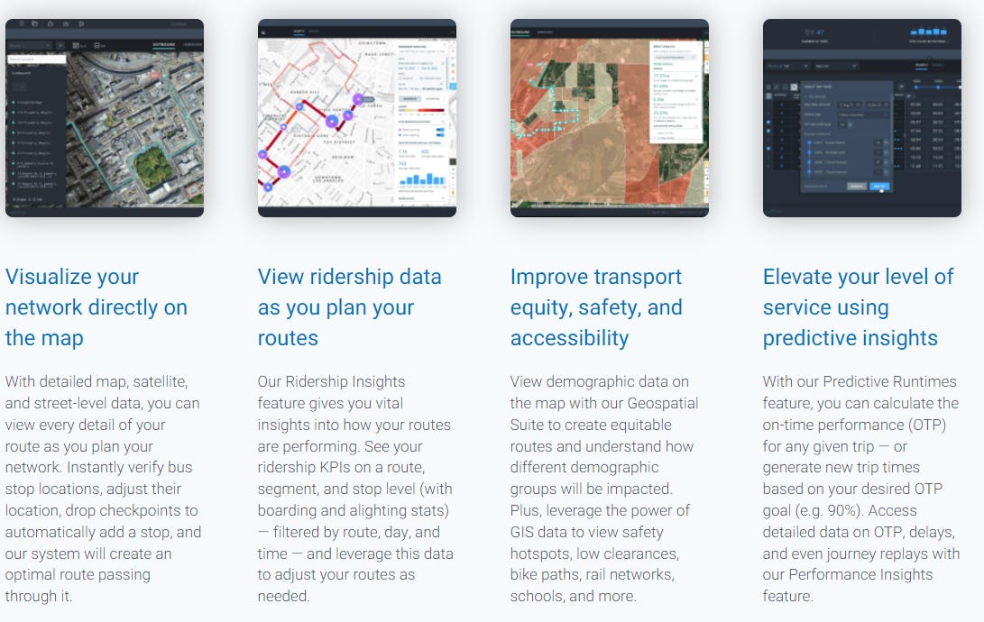 Optibus helps with the entire public transportation funnel, no matter whether you are an operator, an agency, a consultant, a rider, or any entity in between. Fundamentally, the platform does 4 things: