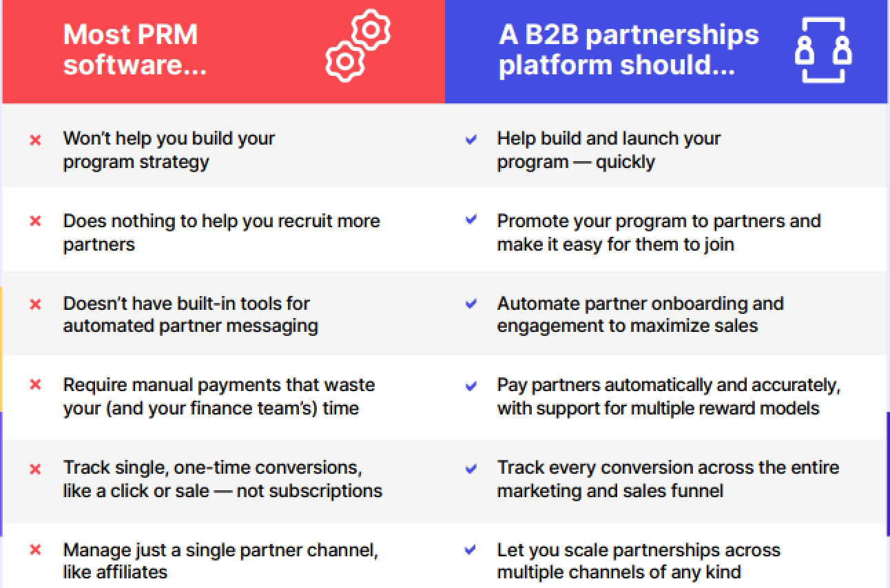 PartnerStack markets itself as a PRM for any type of B2B SaaS company. Appealing to “anyone” is a difficult target to hit; as the phrase goes “if you try to please everyone, you will please no one”. PartnerStack must provide a solution that will provide a custom-tailored solution for every vendor and partner, but the needs of each partner and software vendor are unique. PartnerStack should be careful not to isolate any of them with its broad offering. Claiming to have such range means the solution needs to be robust, cost-competitive, and versatile.