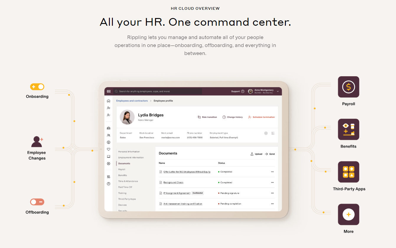 On HR Cloud, Rippling allows for management of: