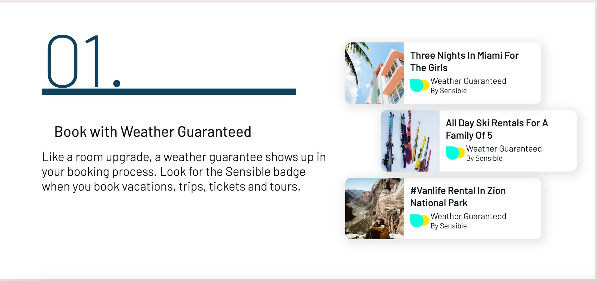 Partnering with Sensible also opens up the travel provider to an entirely new revenue stream, with all of the logistics and details of policies handled directly by Sensible. Most importantly, Sensible pretty much guarantees a memorable and positive travel experience. If a customer purchases a Weather Guarantee and mother nature behaves poorly, your customers will be paid before they are impacted, without paperwork, haggling, or claims.